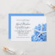 Bleu floral, invitations horizontales de mariage avec un thème de plage. Une grande étoile blanche / étoile de mer est cachée dans une fleur d'hydrangée réaliste pour ce design mariage audacieux. Le texte d'invitation est facile à personnaliser pour votre événement en trois endroits. L'inverse est bleu solide. Un autre choix de papier peut faire baisser le prix de cette invitation.