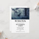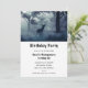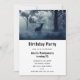 Invitation d'anniversaire avec une photo d'un cerf royal aux bois debout dans une forêt sombre. Neige tombant tout autour.