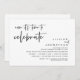 Carte d'invitation de mariage en fuite sur le thème du script noir moderne (C'est maintenant le moment de célébrer). Elle est parfaite pour votre réception de mariage en fuite / fête de célébration post-mariage. Ajoutez vos coordonnées dans la police / lettrage noir correspondant.