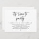 Carte d'invitation de mariage en intime sur le thème du script moderne noir et blanc (c'est l'heure de faire la fête). Elle est parfaite pour votre réception de mariage en intime / fête de célébration après le mariage. Ajoutez vos détails dans la même police noire / lettrage.