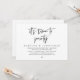 Carte d'invitation de mariage intime sur le thème du script moderne noir et blanc (c'est l'heure de faire la fête). Elle est parfaite pour votre réception de mariage intime / fête de célébration après le mariage. Ajoutez vos coordonnées dans la même police / lettrage noir.