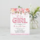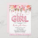 Jolie invitation à la douche bébé avec un simple arrière - plan blanc, une jolie parties scintillant, d'élégantes fleurs d'aquarelle rose, le dicton "c'est une fille", et un modèle de célébration de bébé facile à personnaliser.