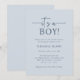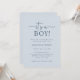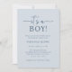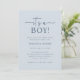 Préparez-vous à accueillir votre petit dans le monde avec cette invitation pour une Baby Shower C'est un garçon qui présente un texte bleu marine sur un fond bleu poussiéreux clair avec un script de calligraphie élégant, parfait pour donner le ton à une célébration sophistiquée !