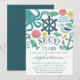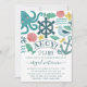 Ahoy! C'est un garçon! Célébrez l'arrivée de votre petit garçon avec ces jolies invitations de baby shower sur le thème marin. Avec des créatures marines: pieuvre, poisson, coquillage, mouette, étoile de mer... ainsi que l'ancre et la barre du navire. Vos détails sont affichés dans une police sans-serif simple avec votre nom dans un script manuscrit. Sur fond bleu marine avec des pois bleu clair.