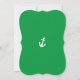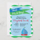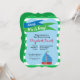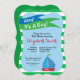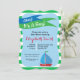 Cette invitation baby shower en forme de crochet présente un thème nautique. Un arrière - plan de rayures horizontales vertes et blanches est accentué avec un drapeau vert et bleu agitant sur le dessus et un voilier mignon près du fond. Le texte sur les drapeaux dit : Ahoy ! C'est un garçon ! Le texte personnalisable au milieu de l'invitation vous permet d'ajouter les détails de votre douche.
