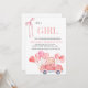 Cette charmante invitation au baby shower célèbre l'arrivée d'une petite fille au design chaleureux et fantaisiste. L'expression "IT'S A GIRL" occupe le devant de la scène dans une police de corail élégante et douce, associée à une illustration décorative en ruban pour une touche de sophistication. Ci-dessous, les détails personnalisés de l'événement sont soigneusement arrangés dans une police gracieuse pour une lisibilité facile. Le fond présente une adorable illustration d'une voiture rouge vintage portant un paquet de ballons roses en forme de coeur, évoquant la joie et la fête. L'ensemble allie chaleur, élégance et ludique, ce qui en fait un lieu idéal pour une célébration spéciale.
