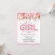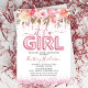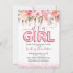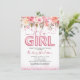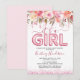 Cartes d'invitation pour une baby shower mignonnes avec un fond blanc simple, de jolis reflets, des fleurs aquarelles roses élégantes, la phrase "c'est une fille", et un modèle de célébration de bébé facile à personnaliser.