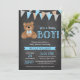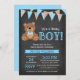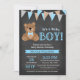 Un joli baby shower garçon ours en peluche invitation. Le design comprend un arrière - plan de tableau noir, une illustration d'ours en peluche et une bannière de bunting en bleu, tan et gris.