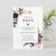 Élégant et chic modèle de report de mariage DIY. Des roses de prune profonde violette et de rose mauve plus clair créent un bel arrangement floral sur un mince cadre doré. La grande variété de feuilles et de vignes lui donne une ambiance botanique moderne.