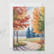 Une aquarelle d'un paysage d'automne avec un chemin de terre serpentant à travers des arbres colorés. Les arbres à gauche ont des feuilles rouges et oranges profonds, tandis que les arbres à droite passent du jaune au vert. Un grand pin bleu se dresse au milieu. Le chemin est peint dans des tons bruns chauds avec des feuilles oranges tombés éparpillés le long. L'arrière - plan présente des collines ondulées dans les tons bleu et violet. Le ciel est peint en bleu et blanc doux, créant une atmosphère d'automne paisible. L'herbe qui longe le chemin est rendue dans différentes nuances de vert et d'or. La peinture a un style lâche et expressif typique des techniques d'aquarelle, avec des traits de brosse visibles et des saignements de couleur. La composition est équilibrée avec les arbres créant de fortes lignes diagonales menant du premier plan à l'arrière - plan. La palette de couleurs globale se compose de rouge, d'oranges, de jaune, de vert, de bleu et de marron, capturant l'essence d'un jour d'automne.