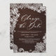 Changez la date ! Annoncez à votre famille et à vos amis le report de votre mariage avec cette carte d'annonce de mariage rustique. Elle présente une dentelle antique florale et feuillue sur un fond en faux bois avec un motif de dentelle assorti. Personnalisez en ajoutant vos noms et d'autres détails. Cette carte d'annulation de mariage à dentelle florale sera également parfaite comme annonce d'élopement.