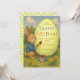 Cette invitation pour une chasse aux œufs de Pâques représente un lapin mignon peignant un gros œuf jaune contenant le texte de l'invitation. Le lapin est marron, porte un manteau bleu, tient un pinceau avec de la peinture rouge qui goutte dans sa main et est allongé sur l'herbe, entouré de fleurs jaunes, avec des arbres et un ciel bleu en arrière-plan. Le titre Chasse aux œufs de Pâques est écrit dans une police décorative, chaque mot d'une couleur différente : bleu, rouge et vert. L'illustration a une atmosphère vintage.