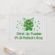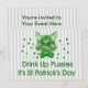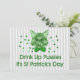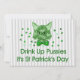 Il est mangé, vert et porte une cravate à l'arc. C'est le chatte à gratte-ciel de la Saint-Paddy's Day et il dit "Buvez des chattes, c'est la Saint-Patrick."