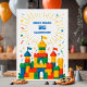 Un design d'anniversaire ludique avec un château en bloc lumineux, des bannières festives et des détails gais, parfait pour une fête amusante et créative pour les enfants.