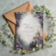 Invitez vos invités dans un monde de romance majestueuse et d'élégance de conte de fées avec cette invitation de mariage exquise. Le design vous transporte dans un paysage montagneux spectaculaire et éthéré, où un grand château de pierre gothique aux flèches imposantes est niché de manière dramatique dans une vallée vibrante. La scène est encadrée par des forêts denses et sombres de pins et des couches de brume épaisse, créant un profond sentiment de solitude et d'émerveillement. Le premier plan est luxueusement rempli d'une bordure abondante de fleurs sauvages violettes, lavande et blanches, formant une arche florale naturelle. L'esthétique, riche en détails picturaux et en lumière douce et diffuse, prépare parfaitement le terrain pour un mariage grandiose, de destination ou sur le thème de la fantaisie. Cette carte d'invitation est idéale pour un mariage grandiose et formel, une célébration ou une réception sur le thème de la fantaisie, ou une fête d'engagement romantique dans les montagnes. Elle conviendrait également parfaitement à un mariage de destination à la campagne ou à une cérémonie de renouvellement de vœux sompt