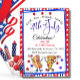 Préparez-vous à surprendre vos invités de fête avec cette mignonne invitation 4 juillet mettant en vedette un hot dog humain et une tranche humaine de pizza agitant fièrement un drapeau américain.