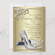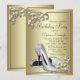 Invitation élégante pour une fête d'anniversaire pour femme avec des tourbillons ivoire, des chaussures à talons hauts scintillantes argentées et un fond doré riche. Vous pouvez facilement personnaliser cette invitation de fête d'anniversaire en ajoutant simplement les détails de votre événement dans le style de police, la couleur et la formulation de votre choix.