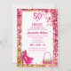 Moderne et élégant, Invitation pour la fête d'anniversaire de la fashionista de 50 ans. Cadre de confettis rose vif brillant de luxe féminin glamour, une belle paire de talons hauts avec des nœuds est posée dans le coin gauche et un charmant sac doré rose est posé dans le coin inférieur droit, script "50 & Fabuleux" rose vif fuchsia sur fond blanc. Vous pouvez facilement modifier votre nom et votre adresse, les polices, la couleur, la taille et le numéro d'âge en cliquant sur les options de personnalisation de Zazzle.