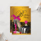 Élégante dentelle, flacon de parfum noir et rose vif, rouge à lèvres et chaussure à talon zèbre rose vif doré, invitation pour une fête d'anniversaire. Cette jolie invitation de fête d'anniversaire zèbre rose vif est facilement personnalisable pour votre événement en ajoutant vos détails d'événement, style de police, taille et couleur de police, et libellé.