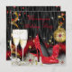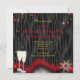 Fête de Noël au champagne. Chaussures à talons hauts rouges scintillantes. Flocons de neige festifs, paillettes et banderoles dorées. Plumes noires et blanches fantastiques sur une fête d'entreprise noire et dorée. Fête de Noël élégante. Invitations à la fête. Invitations élégantes et classe pour toutes les occasions. Modèle d'invitation à la fête à personnaliser avec vos propres détails.