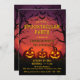 Lancer une fête "Spooktacular" avec cette invitation de fête d'anniversaire d'Halloween. Le design présente un ciel crépusculaire dramatique en orange et violet vif, avec des chauves-souris silhouettes qui gonflent au-dessus. Des arbres nus et narcés encadrent la carte, menant les yeux vers trois classiques de trituration qui ancrent la scène avec une joie festive. C'est l'invitation parfait pour donner un ton amusant et éffrayant à votre événement spécial.