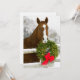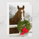 Cheval regardant par-dessus la clôture dans la neige à côté d'une couronne de Noël