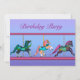 Belle invitation de fête d'anniversaire pour filles avec des chevaux de carrousel peints en violet, bleu sarcelle et rose.