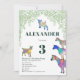 Chèvres colorées en rose vif, violet, bleu, orange, jaune et aqua avec un arrière - plan vert feuillage. Une invitation à la fête du 3e anniversaire d'animaux de ferme mignons avec des chèvres et des chèvres debout sur des chèvres. Cette invitation amusante à la fête est facile à personnaliser pour créer une invitation unique à la fête adaptée aux enfants et aux amateurs de chèvre adulte. Chèvre psychédélique colorée illustrations originales de l'artiste Catherine Sweetman