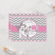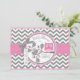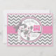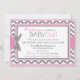 Ecran chic en chevron gris et blanc avec un hibou rose perché sur une branche de chêne et une carte d'invitation baby shower à l'arc et au ruban à look 3D.