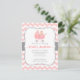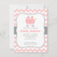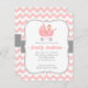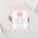 Poussette rose avec le bébé mignon à elle et à un arrière-plan rose et blanc chic et élégant de motif de chevron. Bannière grise avec le centre blanc avec des effets de point pour indiquer des détails de partie. Cette carte simple d'invitation avec sa palette rose, blanche et grise est idéale pour n'importe qui qui prévoit un baby shower ou a eu besoin d'un faire-part pour l'arrivée d'un bébé nouveau-né. La carte d'invitation peut être facilement personnalisée avec vos détails de partie.