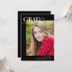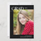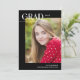Ce carte photo moderne de remise de diplômes présente une présentation éditoriale chic et une grande photo. Sur le devant, "Grad" est écrit en simple, tendance tous les casquettes en lettres en haut à gauche, avec l'année de graduation à droite. La conception typographique chevauche une grande photo verticale. En bas, ajoutez le nom et l'école du diplômé. La typographie est blanche contre un arrière - plan noir. Le verso de la carte de graduation comprend un modèle optionnel pour ajouter les détails de la fête de graduation.