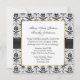 Une élégante invitation à un mariage carré faite sur une base damassée en noir et blanc, avec une bande noire, au milieu, et un carré en texte blanc aux bords dorés. L'arrière de l'invitation a le même motif damassé noir et blanc qui le recouvre et les graphiques d'un ruban noir et d'un arc, au milieu. Le texte noir, à l'avant et à l'arrière est entièrement personnalisable et prêt à être personnalisé pour votre journée spéciale. Produits correspondants disponibles.