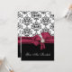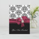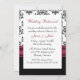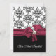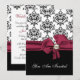 Élégante invitation à dîner de répétition de mariage, faite en noir, blanc et bordeaux. Graphiques d'un joli motif damassé noir et blanc, sur le dessus, et noir solide, sur le fond, de l'invitation, avec un joli arc bordeaux, au centre, avec une décoration en perle à l'aspect bauble. Vous êtes invité, en texte de script blanc, sur le devant de l'invitation, et en texte noir et bordeaux, sur le dos est entièrement personnalisable pour répondre à vos besoins d'événement. Jolie invitation au couple sera chère, avec tous leurs souvenirs mariages.