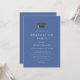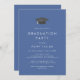 Cette invitation chic à la remise des diplômes de casquette de grade bleu est parfaite pour une fête extérieure moderne. Le design simple présente une typographie classique bleu et blanc avec un casquette de graduation noir et or.