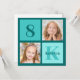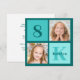 Chic invitation de fête d'anniversaire turquoise à 2 photos pour une fille branchée. Célébrez l'anniversaire de votre enfant avec deux belles photographies d'eux sur cette invitation avec des carrés turquoise où vous pouvez ajouter votre propre photo. Ajoutez le nom et l'âge de votre enfant.