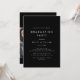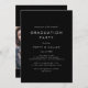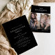 Cette invitation chic à la double remise des diplômes en noir foncé est parfaite pour une fête extérieure moderne. Le design sobre et sombre présente une typographie minimaliste classique en noir et blanc, dans un style élégant et sophistiqué. Personnalisable dans n'importe quelle couleur. Organisez une fête pour 2 diplômés. Personnalisez le dos avec une photo de chaque grade et de leur école.