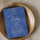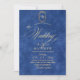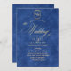 Elégante faire-part de mariage moderne bleu et or avec une police manuscrite élégante avec des boucles et un monogramme de la mariée et du marié. Invitation classique et élégante, simple et moderne.