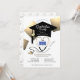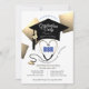 Faites-nous part de vos projets de fête avec ces invitations chic à l'obtention du diplôme d'infirmière. Ce design comprend du texte personnalisable, une illustration de capuchon de graduation noir avec des accents de carré d'impression d'or à la fausse glitterie, et un stéthoscope d'or et de noir sur un arrière - plan blanc. Le dos a un motif stéthoscope sur un arrière - plan blanc. Les couleurs de ce design sont en blanc, noir, gris, or et bleu. Utilisez le bouton Personnaliser pour mettre à jour les informations, puis sélectionnez les options d'impression et/ou de conception téléchargeable. Conception par Ms_Jade.