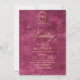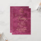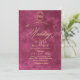 Elégante faire-part de mariage moderne fuchsia et or avec une police manuscrite élégante avec des boucles et un monogramme de la mariée et du marié. Invitation classique et élégante, simple et moderne.
