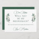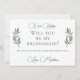 Une botanique verte simplement élégante Serez-vous mon invitation de demoiselle d'honneur avec deux feuilles d'eucalyptus aquarelle de chaque côté au sommet autour de la question. Une belle carte minimaliste de proposition de fête de mariée avec une verdure chic et moderne.