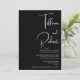 Faites une déclaration d'élégance sobre avec notre Faire-part de mariage Chic Monochrome noir et blanc. Cette invitation respire le raffinement et le style intemporel avec son design chic monochrome. La palette de couleurs noir et blanc crée une esthétique épurée et moderne, parfaite pour les couples qui apprécient le design épuré et minimaliste. Le stock de cartes de haute qualité et l'impression précise assurent un look et une sensation luxueux. Avec des détails personnalisables, vous pouvez personnaliser l'invitation avec vos noms, date du mariage et informations sur le lieu. Que vous planifiez une aventure formelle ou une fête intime, nos Faire-part de mariage Chic Monochrome Noir et Blanc préparent le terrain pour un événement inoubliable. Laissez la simplicité monochrome parler des volumes et impressionner vos invités avec sa beauté sans effort. Envoyez la première impression parfaite avec notre Faire-part de mariage Chic Monochrome Noir et Blanc et commencez votre voyage mariage avec un style et une sophistication intemporels. Partie de la collection de Mariages noirs et blancs.