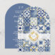 This elegant design combines a central monogram with Mediterranean tile motifs, lemons, and carefully illustrated flowers, creating a sophisticated and harmonious composition. The ornamental details and bright color palette convey freshness, vitality, and a chic atmosphere, evoking a sunny Mediterranean vibe ideal for elegant and memorable weddings.