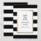 Cette élégante, audacieuse et moderne carte de Save the Date de mariage rayée noir et blanc est extrêmement tendance. Avec un overlay blanc bordé de feuille de faux or rose, le texte est écrit dans une police sans serif élégante et intemporelle. Le dos de la carte présente les mêmes rayures horizontales noires et blanches audacieuses que celles de l'avant. L'invitation parfaite pour la mariée exigeante, et partie d'une Suite d'Invitation.