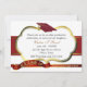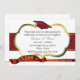 Elégante invitation à la fête de graduation faite en blanc et rouge, avec des accents de ton or. Une zone de texte décorative en or bordée de blanc a du texte jaune doré et noir prêt à être personnalisé. Arrière - plan blanc, avec des graphiques d'un ruban rouge et or au milieu, un casquette de mortier de diplômé rouge, au sommet, et une bannière rouge et or, au fond. Une belle invitation à la fête de remise de diplômes.
