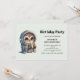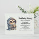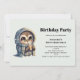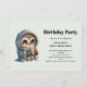 Une invitation d'anniversaire avec une jolie illustration d'un chouette en robe d'hiver et d'un foulard tenant un café chaud.