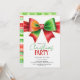 Christmas red and green bow and snowflakes party holiday invitation. This holiday invitation captures the essence of Christmas with its use of traditional bold combination of red and vibrant emerald green. At the upper part of the design is an oversized bow, made from luxurious red and festive green ribbons, with a white geometric snowflake. The invitation's main message, "Christmas Party," stands out with a mix of elegant script and decorative block lettering, creating an eye-catching contrast. On the reverse side, a delightful surprise awaits with a pattern of irregular stripes in the signature red and green, playfully adorned with delicate snowflakes that evoke a sense of winter wonder.