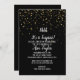 Cette invitation de fête d'anniversaire Chut ! C'est une surprise confettis dorés sur fond noir est parfaite pour une célébration d'anniversaire élégante. Le design présente de faux confettis dorés sur fond noir avec une calligraphie blanche élégante.