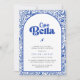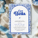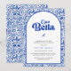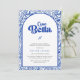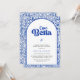 Celebrate the bride-to-be with a chic Italian-inspired bridal shower invitation. This design features a bold blue and white color palette with a classic Mediterranean tile pattern. The detailed floral border frames a soft arched center panel, creating a clean and elegant layout.