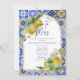 Décor d'inspiration méditerranéenne avec tuiles italiennes Amalfi bleu et jaune vif, citrons aquarellés et cadre en arc de parties scintillant en faux or.