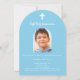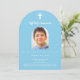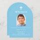 Un arrière - plan bleu ciel, décoré d'une croix blanche Personnalisez et ajoutez un nom photo et des détails. Texte blanc. Cadre photo en forme d'arc.